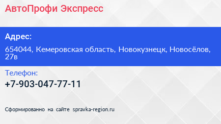 АвтоПрофи & Экспресс по адресу 654044, Кемеровская область, Новокузнецк, Новосёлов, 27в в дальнейшем Организация, размещена в следующих категориях: