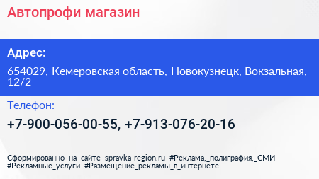 Автопрофи, магазин по адресу 654029, Кемеровская область, Новокузнецк, Вокзальная, 12/2 в дальнейшем Организация, размещена в следующих категориях: