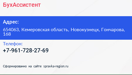 БухАссистент по адресу 654063, Кемеровская область, Новокузнецк, Гончарова, 168 в дальнейшем Организация, размещена в следующих категориях: