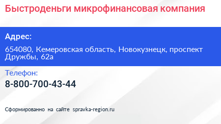 Быстроденьги, микрофинансовая компания по адресу 654080, Кемеровская область, Новокузнецк, проспект Дружбы, 62а в дальнейшем Организация, размещена в следующих категориях: