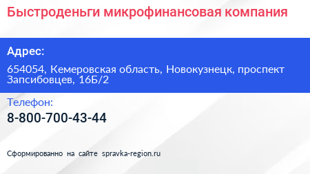 Быстроденьги, микрофинансовая компания по адресу 654054, Кемеровская область, Новокузнецк, проспект Запсибовцев, 16Б/2 в дальнейшем Организация, размещена в следующих категориях: