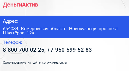 ДеньгиАктив по адресу 654084, Кемеровская область, Новокузнецк, проспект Шахтёров, 12а в дальнейшем Организация, размещена в следующих категориях:
