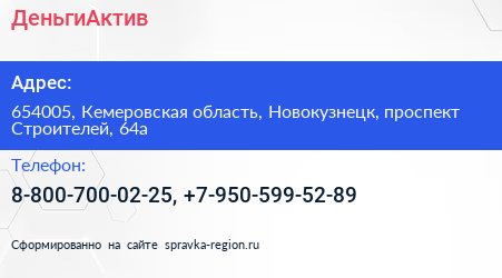 ДеньгиАктив по адресу 654005, Кемеровская область, Новокузнецк, проспект Строителей, 64а в дальнейшем Организация, размещена в следующих категориях: