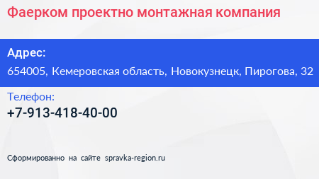Фаерком, проектно-монтажная компания по адресу 654005, Кемеровская область, Новокузнецк, Пирогова, 32 в дальнейшем Организация, размещена в следующих категориях: