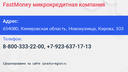FastMoney, микрокредитная компания по адресу 654080, Кемеровская область, Новокузнецк, Кирова, 103 в дальнейшем Организация, размещена в следующих категориях: