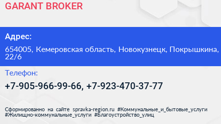 GARANT BROKER по адресу 654005, Кемеровская область, Новокузнецк, Покрышкина, 22/6 в дальнейшем Организация, размещена в следующих категориях: