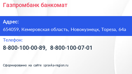 Газпромбанк, банкомат по адресу 654059, Кемеровская область, Новокузнецк, Тореза, 64а в дальнейшем Организация, размещена в следующих категориях: