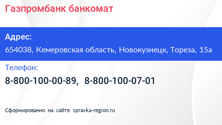 Газпромбанк, банкомат по адресу 654038, Кемеровская область, Новокузнецк, Тореза, 15а в дальнейшем Организация, размещена в следующих категориях: