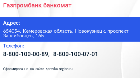 Газпромбанк, банкомат по адресу 654054, Кемеровская область, Новокузнецк, проспект Запсибовцев, 16Б в дальнейшем Организация, размещена в следующих категориях: