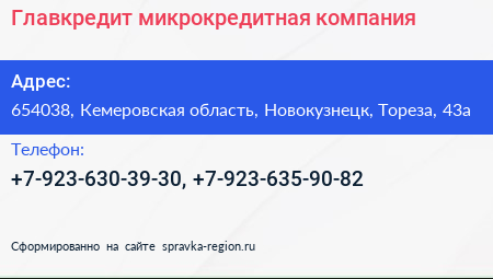 Главкредит, микрокредитная компания по адресу 654038, Кемеровская область, Новокузнецк, Тореза, 43а в дальнейшем Организация, размещена в следующих категориях: