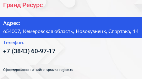 Гранд Ресурс по адресу 654007, Кемеровская область, Новокузнецк, Спартака, 14 в дальнейшем Организация, размещена в следующих категориях: