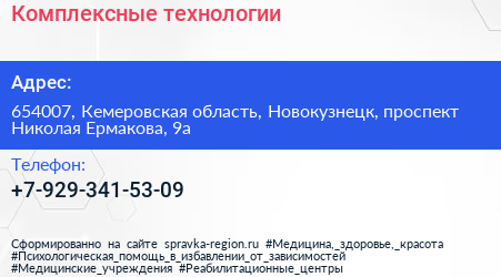 Комплексные технологии по адресу 654007, Кемеровская область, Новокузнецк, проспект Николая Ермакова, 9а в дальнейшем Организация, размещена в следующих категориях: