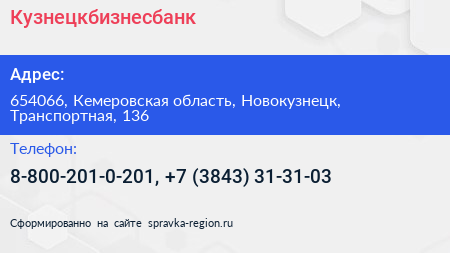 Кузнецкбизнесбанк по адресу 654066, Кемеровская область, Новокузнецк, Транспортная, 136 в дальнейшем Организация, размещена в следующих категориях: