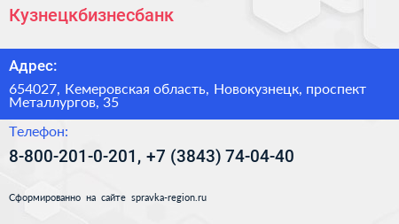 Кузнецкбизнесбанк по адресу 654027, Кемеровская область, Новокузнецк, проспект Металлургов, 35 в дальнейшем Организация, размещена в следующих категориях: