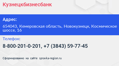 Кузнецкбизнесбанк по адресу 654043, Кемеровская область, Новокузнецк, Космическое шоссе, 16 в дальнейшем Организация, размещена в следующих категориях: