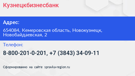 Кузнецкбизнесбанк по адресу 654084, Кемеровская область, Новокузнецк, Новобайдаевская, 2 в дальнейшем Организация, размещена в следующих категориях: