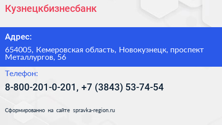 Кузнецкбизнесбанк по адресу 654005, Кемеровская область, Новокузнецк, проспект Металлургов, 56 в дальнейшем Организация, размещена в следующих категориях: