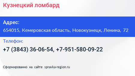Кузнецкий ломбард по адресу 654015, Кемеровская область, Новокузнецк, Ленина, 72 в дальнейшем Организация, размещена в следующих категориях: