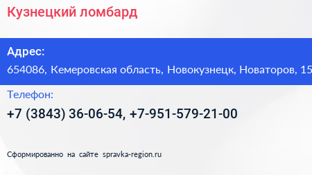 Кузнецкий ломбард по адресу 654086, Кемеровская область, Новокузнецк, Новаторов, 15 в дальнейшем Организация, размещена в следующих категориях: