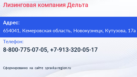 Лизинговая компания Дельта по адресу 654041, Кемеровская область, Новокузнецк, Кутузова, 17а в дальнейшем Организация, размещена в следующих категориях: