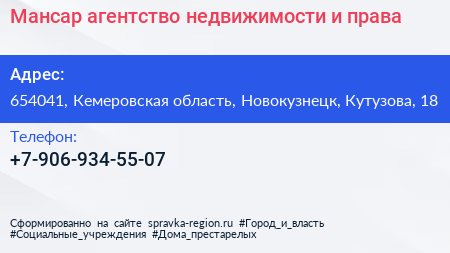 Мансар, агентство недвижимости и права по адресу 654041, Кемеровская область, Новокузнецк, Кутузова, 18 в дальнейшем Организация, размещена в следующих категориях:
