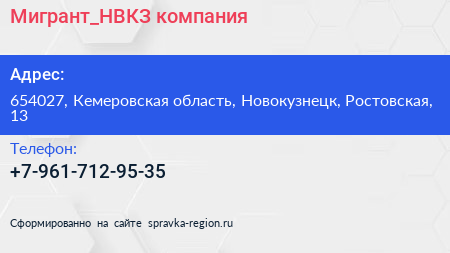Мигрант_НВКЗ, компания по адресу 654027, Кемеровская область, Новокузнецк, Ростовская, 13 в дальнейшем Организация, размещена в следующих категориях: