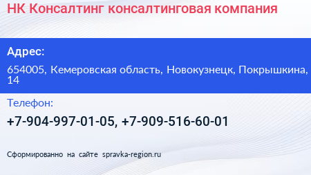 НК-Консалтинг, консалтинговая компания по адресу 654005, Кемеровская область, Новокузнецк, Покрышкина, 14 в дальнейшем Организация, размещена в следующих категориях: