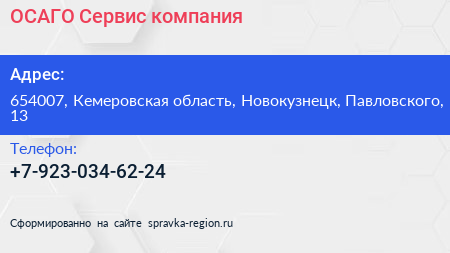 ОСАГО-Сервис, компания по адресу 654007, Кемеровская область, Новокузнецк, Павловского, 13 в дальнейшем Организация, размещена в следующих категориях: