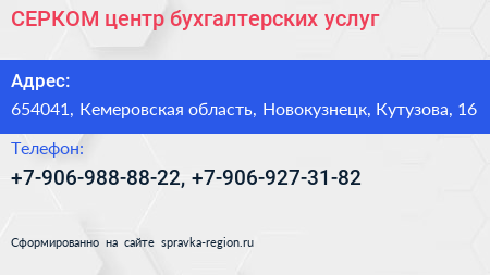 СЕРКОМ, центр бухгалтерских услуг по адресу 654041, Кемеровская область, Новокузнецк, Кутузова, 16 в дальнейшем Организация, размещена в следующих категориях:
