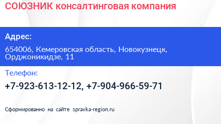 СОЮЗНИК, консалтинговая компания по адресу 654006, Кемеровская область, Новокузнецк, Орджоникидзе, 11 в дальнейшем Организация, размещена в следующих категориях: