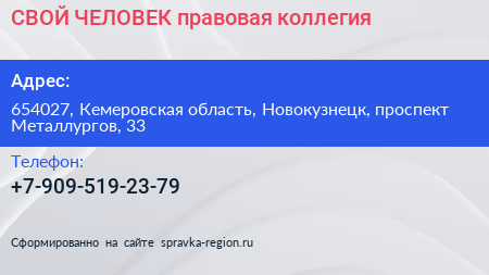 СВОЙ ЧЕЛОВЕК, правовая коллегия по адресу 654027, Кемеровская область, Новокузнецк, проспект Металлургов, 33 в дальнейшем Организация, размещена в следующих категориях:
