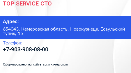 TOP SERVICE, СТО по адресу 654043, Кемеровская область, Новокузнецк, Есаульский тупик, 15 в дальнейшем Организация, размещена в следующих категориях: