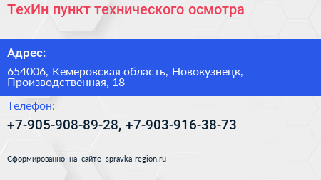 ТехИн, пункт технического осмотра по адресу 654006, Кемеровская область, Новокузнецк, Производственная, 18 в дальнейшем Организация, размещена в следующих категориях: