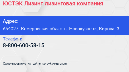 ЮСТЭК-Лизинг, лизинговая компания по адресу 654027, Кемеровская область, Новокузнецк, Кирова, 3 в дальнейшем Организация, размещена в следующих категориях: