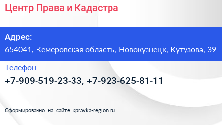 Центр Права и Кадастра по адресу 654041, Кемеровская область, Новокузнецк, Кутузова, 39 в дальнейшем Организация, размещена в следующих категориях: