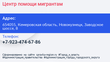 Центр помощи мигрантам по адресу 654055, Кемеровская область, Новокузнецк, Заводское шоссе, 8 в дальнейшем Организация, размещена в следующих категориях: