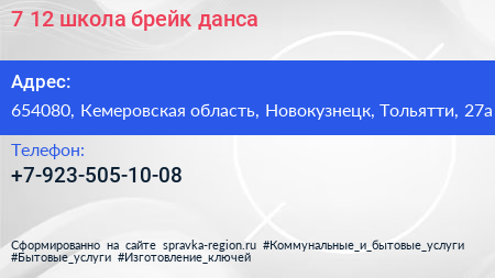 7.12, школа брейк-данса по адресу 654080, Кемеровская область, Новокузнецк, Тольятти, 27а в дальнейшем Организация, размещена в следующих категориях:
