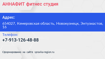 АННАФИТ, фитнес-студия по адресу 654027, Кемеровская область, Новокузнецк, Энтузиастов, 16 в дальнейшем Организация, размещена в следующих категориях: