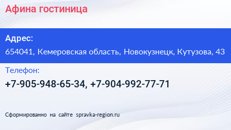 Афина, гостиница по адресу 654041, Кемеровская область, Новокузнецк, Кутузова, 43 в дальнейшем Организация, размещена в следующих категориях:
