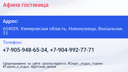 Афина, гостиница по адресу 654029, Кемеровская область, Новокузнецк, Вокзальная, 15 в дальнейшем Организация, размещена в следующих категориях: