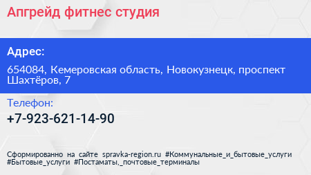 Апгрейд, фитнес-студия по адресу 654084, Кемеровская область, Новокузнецк, проспект Шахтёров, 7 в дальнейшем Организация, размещена в следующих категориях: