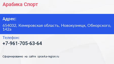 Арабика Спорт по адресу 654032, Кемеровская область, Новокузнецк, Обнорского, 142а в дальнейшем Организация, размещена в следующих категориях: