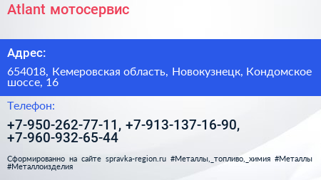 Atlant, мотосервис по адресу 654018, Кемеровская область, Новокузнецк, Кондомское шоссе, 16 в дальнейшем Организация, размещена в следующих категориях: