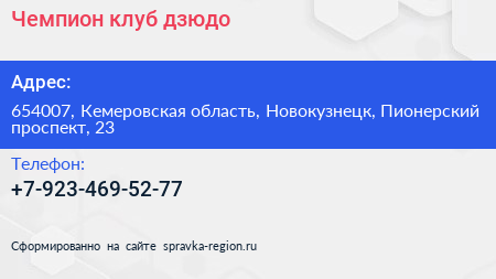 Чемпион, клуб дзюдо по адресу 654007, Кемеровская область, Новокузнецк, Пионерский проспект, 23 в дальнейшем Организация, размещена в следующих категориях: