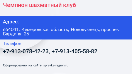 Чемпион, шахматный клуб по адресу 654041, Кемеровская область, Новокузнецк, проспект Бардина, 26 в дальнейшем Организация, размещена в следующих категориях: