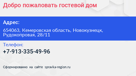 Добро пожаловать, гостевой дом по адресу 654063, Кемеровская область, Новокузнецк, Рудокопровая, 28/11 в дальнейшем Организация, размещена в следующих категориях: