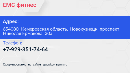 ЕМС фитнес по адресу 654080, Кемеровская область, Новокузнецк, проспект Николая Ермакова, 30а в дальнейшем Организация, размещена в следующих категориях: