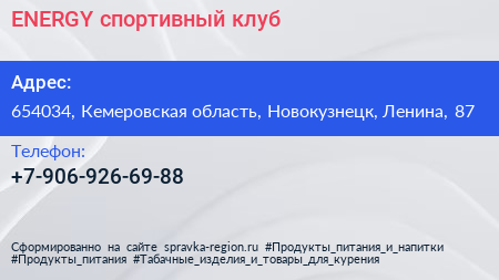 ENERGY, спортивный клуб по адресу 654034, Кемеровская область, Новокузнецк, Ленина, 87 в дальнейшем Организация, размещена в следующих категориях: