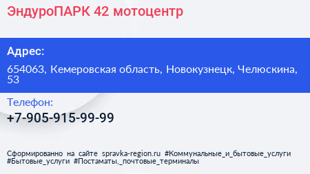 ЭндуроПАРК 42, мотоцентр по адресу 654063, Кемеровская область, Новокузнецк, Челюскина, 53 в дальнейшем Организация, размещена в следующих категориях: