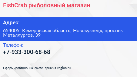 FishCrab, рыболовный магазин по адресу 654005, Кемеровская область, Новокузнецк, проспект Металлургов, 39 в дальнейшем Организация, размещена в следующих категориях: